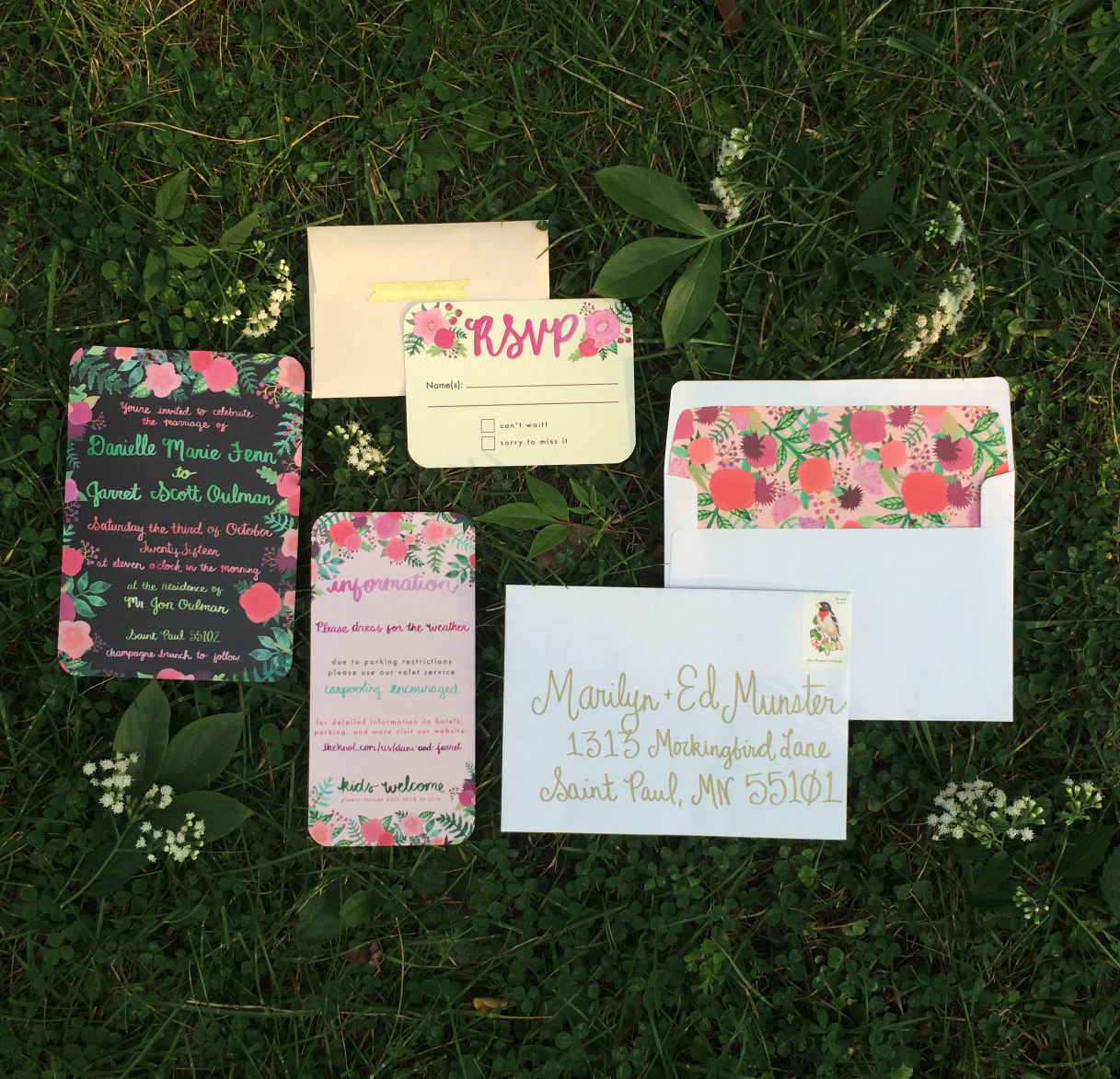 I made these invitations for the first wedding that I’m actually helping to plan. It feels so great to help another couple make their dream wedding a reality. This is a Memorial weekend celebration for an American bride and her Columbian fiancée. The theme is to tie tropical South American flowers with Minnesotan botanicals, in a low-key evening soiree. Twinkle lights are mandatory. More to come soon…